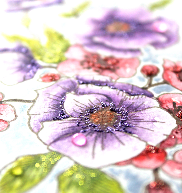 I randomly adhered flowers and leaves onto an A2 cream paper panel using foam tape, then added Crystal Clear Gem Sparkles between the flowers and leaves.