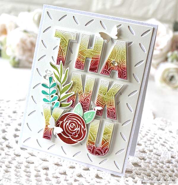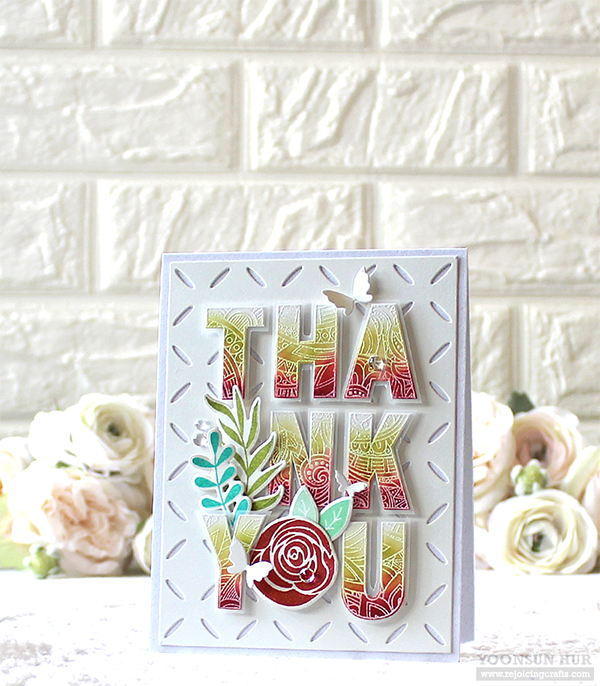 I started by heat embossing the word “THANK YU (except “O”)” from the
