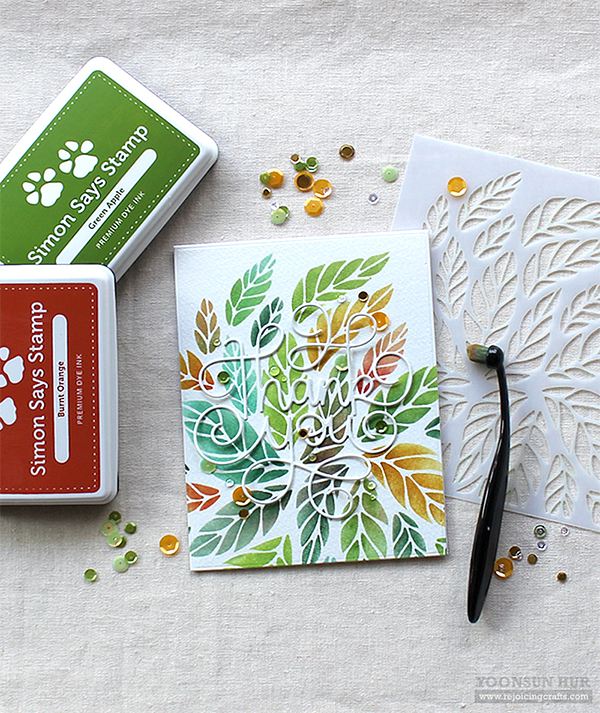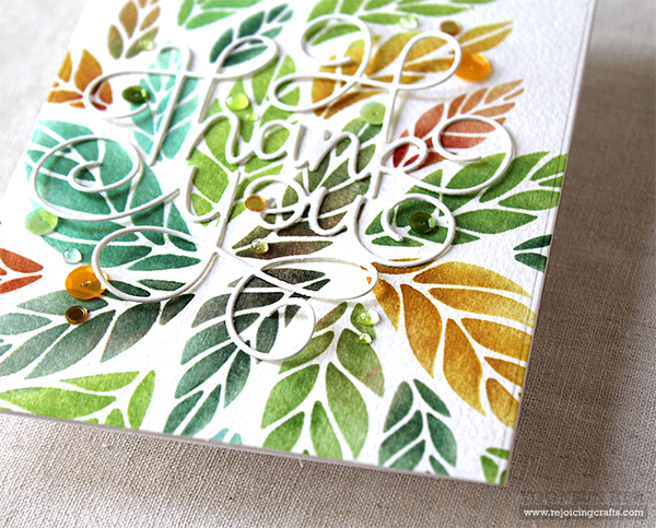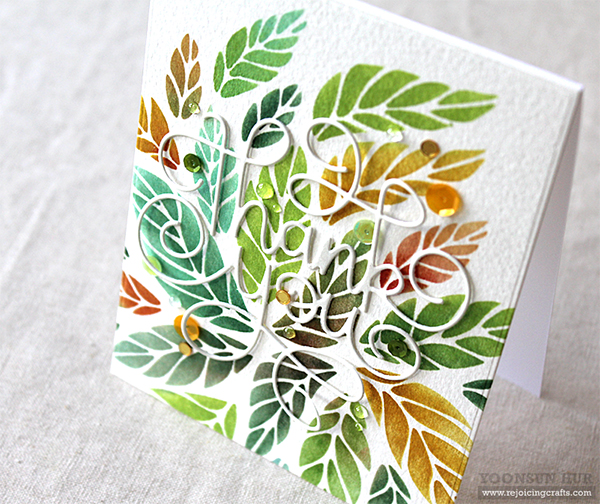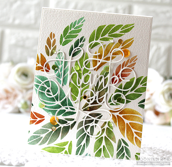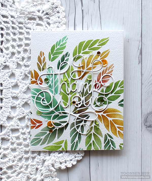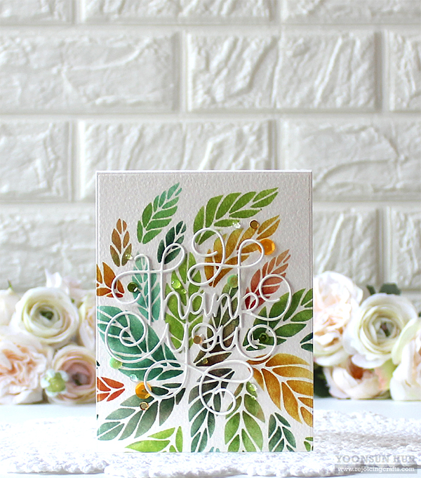 I mounted the autumn leafy background panel on white card base using double-sided tape first, and then added the sentiment die cut on it using ZIG fine tip glue pen.