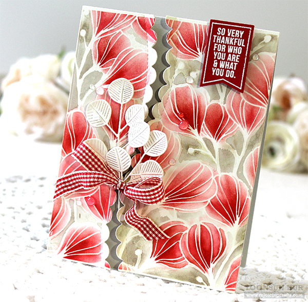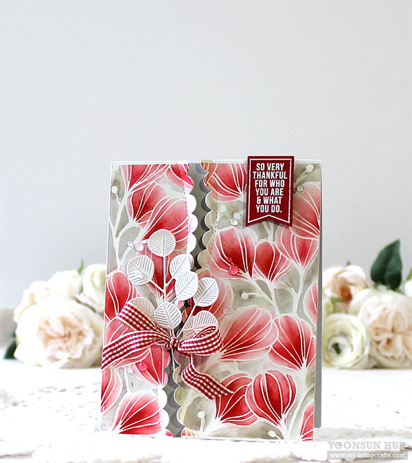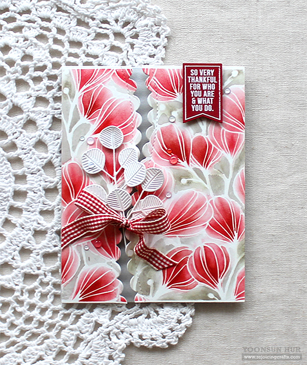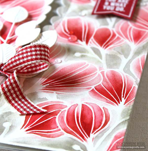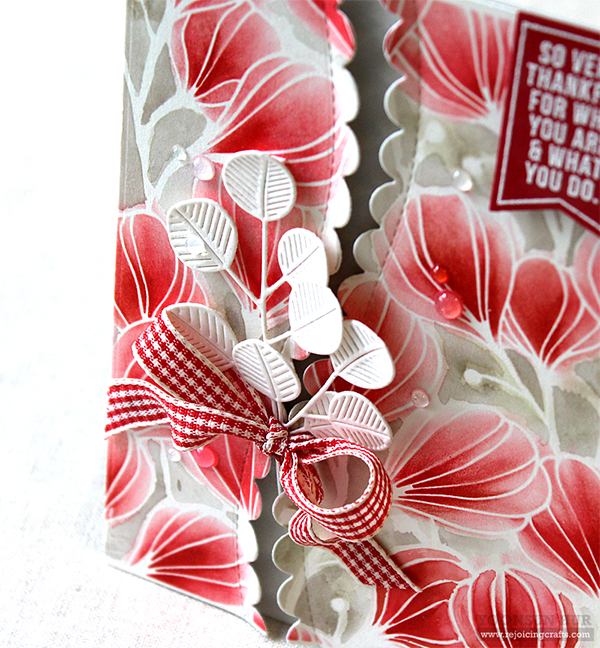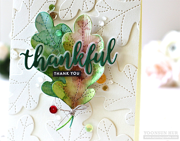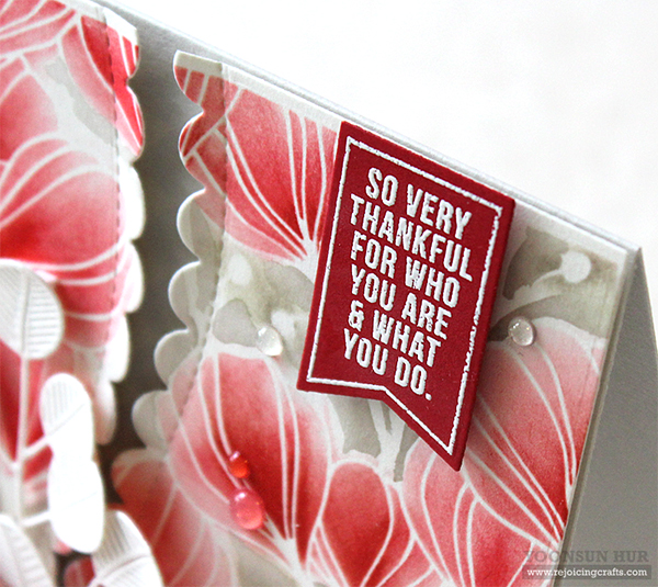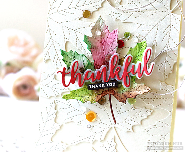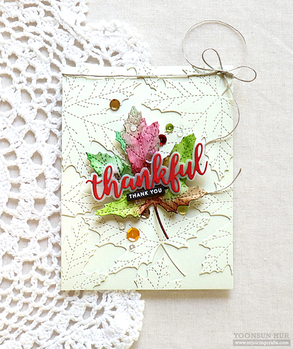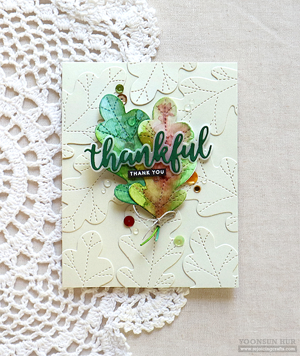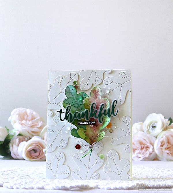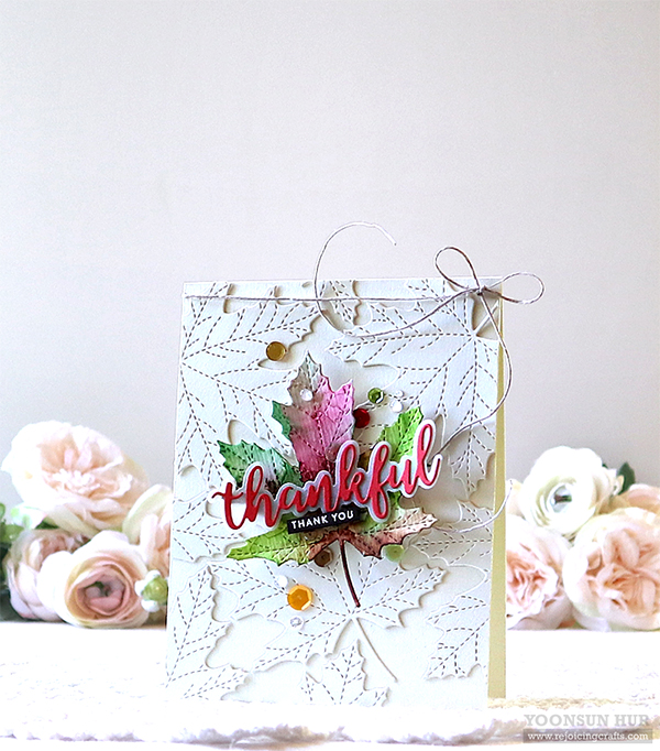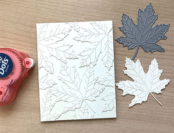 For the background of the card, I made white tone-on-tone leafy patterns. I die cut several stitched leaves from white cardstock, and then randomly adhered them on white card base using double-sided tape (as shown in the picture).