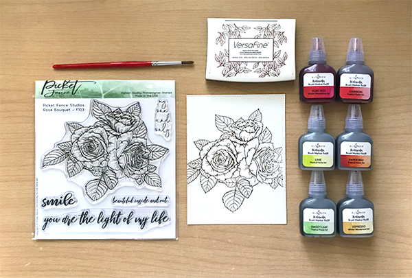 Let’s start to watercolouring, yay! I stamped a bunch of roses onto watercolour paper using VersaFine Vintage Sepia pigment ink first, and then coloured the stamped image with Altenew liquid watercolours.