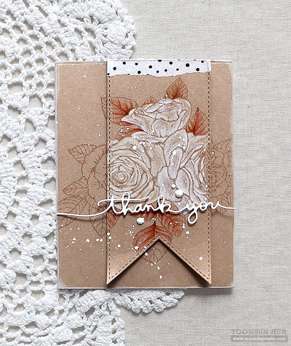 For my second card, I made white roses on kraft card using the Rose Bouquet stamp set. I die cut 4.25″ x 5.5″ basic rectangle panel & 2.5″ x 6″ stitched fishtail banner from kraft cardstock, and then stamped rose bouquet onto both kraft base using Altenew Rocky Shore dye ink – I definitely used MISTI for stamping in the exact same place.