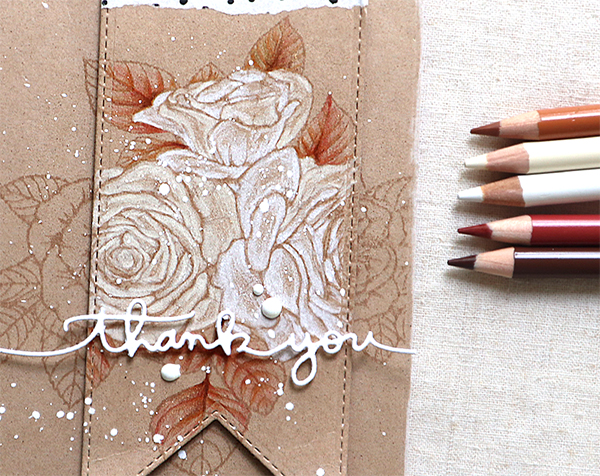 I coloured the stamped image on fishtail banner using Faber Castell polychromos colored pencils. I added opaque white ink splatters and white enamel dots. :)