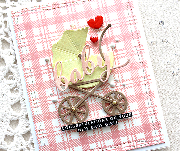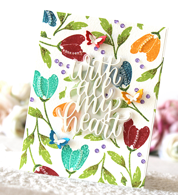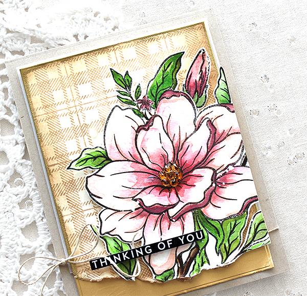 For this card, I used brand new Layered Foliage stencil and Grateful Script die.