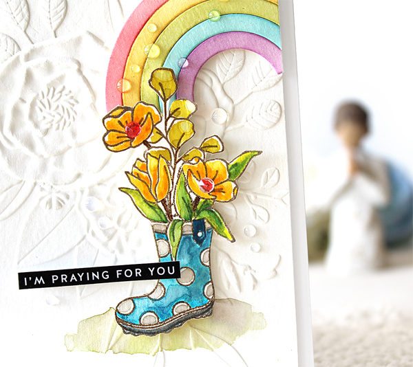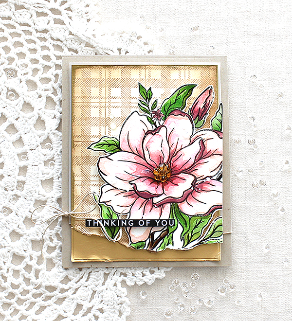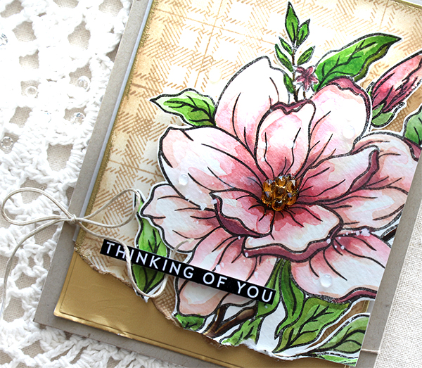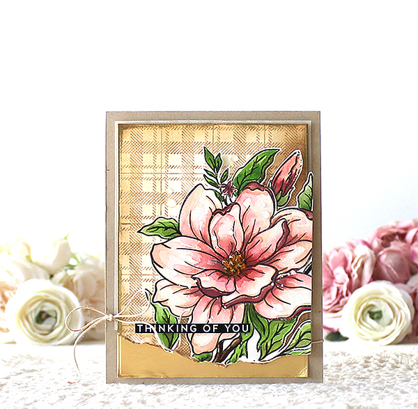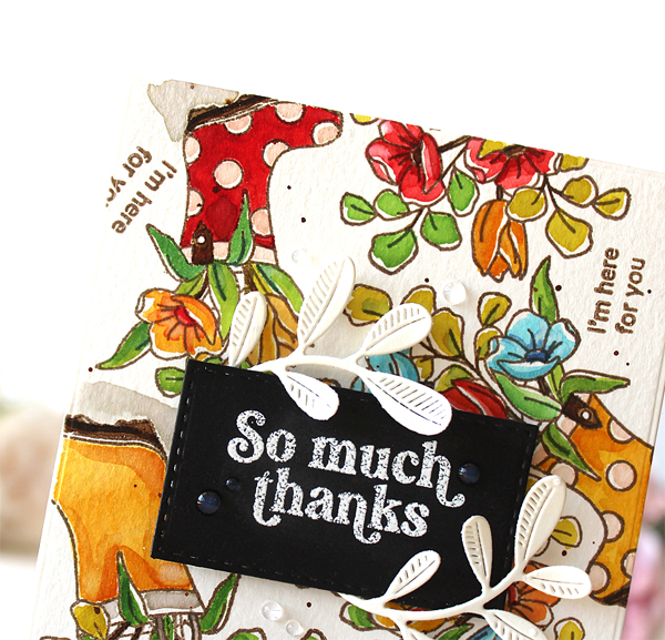 I made a watercoloured autumn foliage wreath, die cut the word “Grateful” from metallic gold cardstock and then mounted them on the Pretty Petals Background panel.