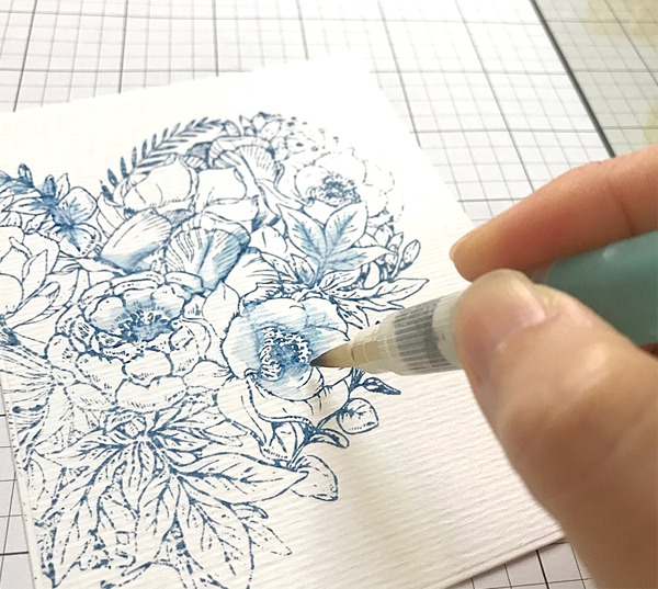 I stamped the holiday flowers on A2 sized watercolour paper panel using Antique Linen Distress ink first, and then coloured the stamped image with Tonic Nuvo Aqua Flow Pens:
