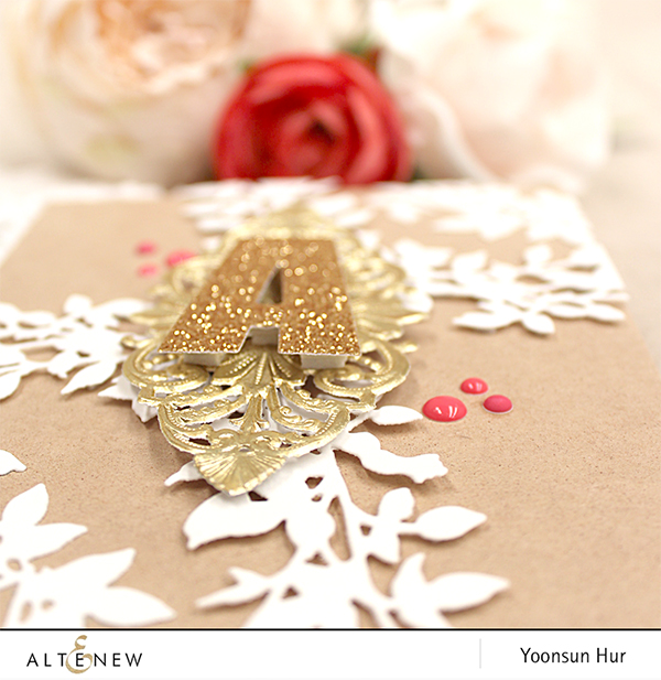 I assembled stitched flowers and leaves to make bouquet using adhesives as you can see the picture, then decorated bouquet, wrist, and gold ‘blessed’ sentiment with Paper Rose Studio Clear Crystals because it’s a card to celebrate a beautiful bride, it’s perfectly fine to add as many sparkling crystals as we can! :D