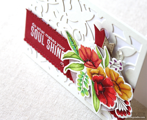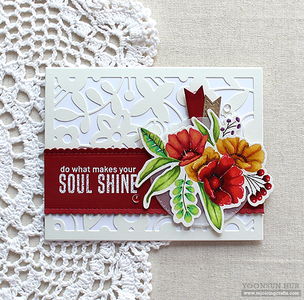 I started by die cutting floral panel from white card stock using the Fancy Floral 1 die. I then stamped a flower cluster from the Fancy Blooms set on white card stock using black dye ink, coloured the stamped image with alcohol markers, then die cut it with the matching die in the Fancy Blooms die set.