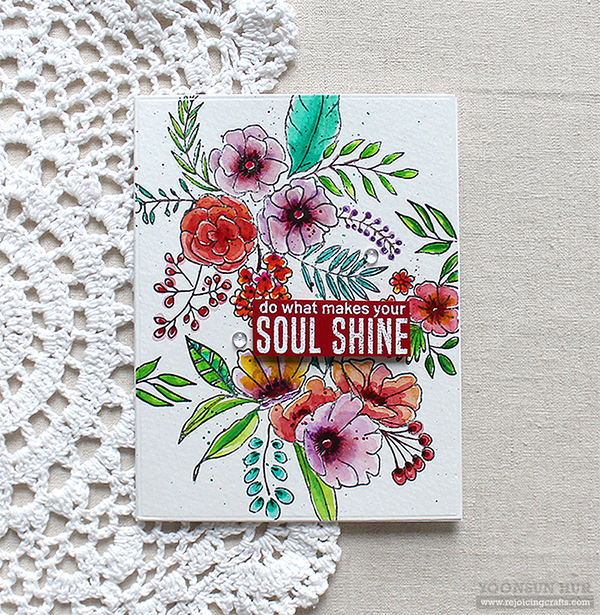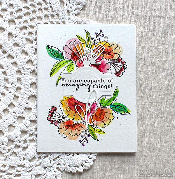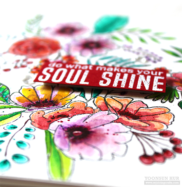 For my second card, I randomly stamped flowers & leaves from the Fancy Blooms set on watercolour paper panel using black pigment ink first, and then coloured all stamped images with Liquid Watercolors.