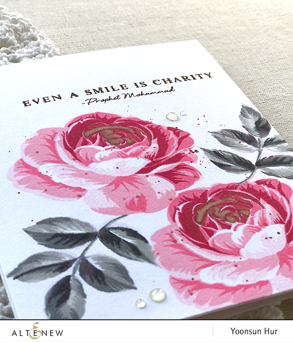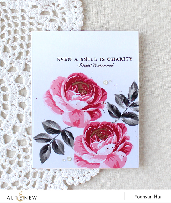 I stamped layered roses and leaves on white paper panel with dye inks, sentiment using Walnut Stain Distress ink. I then added red ink splatters.