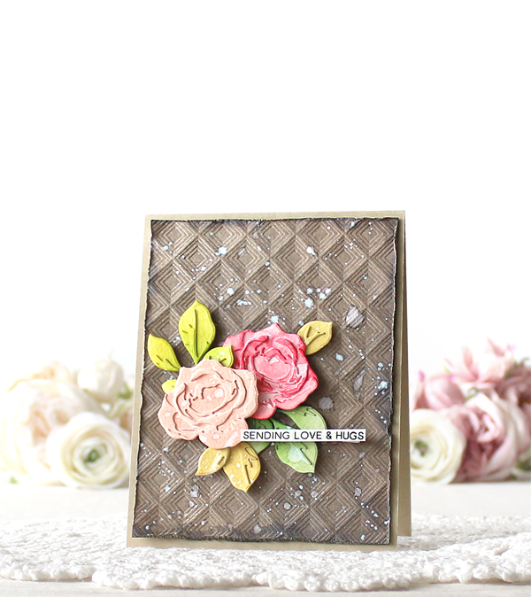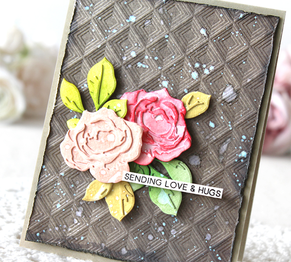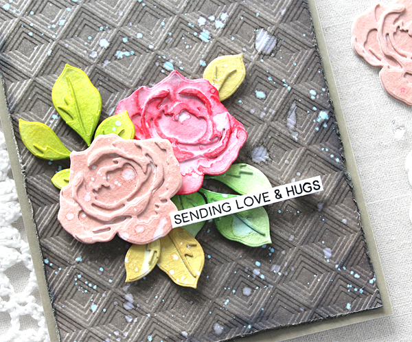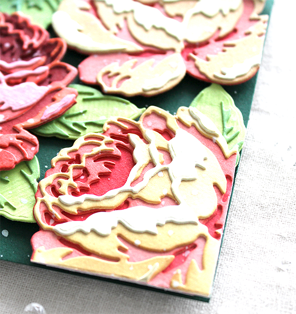 After inking all pieces, assembled them as roses and leaves, then adhered them on dark green card base using foam tape.
