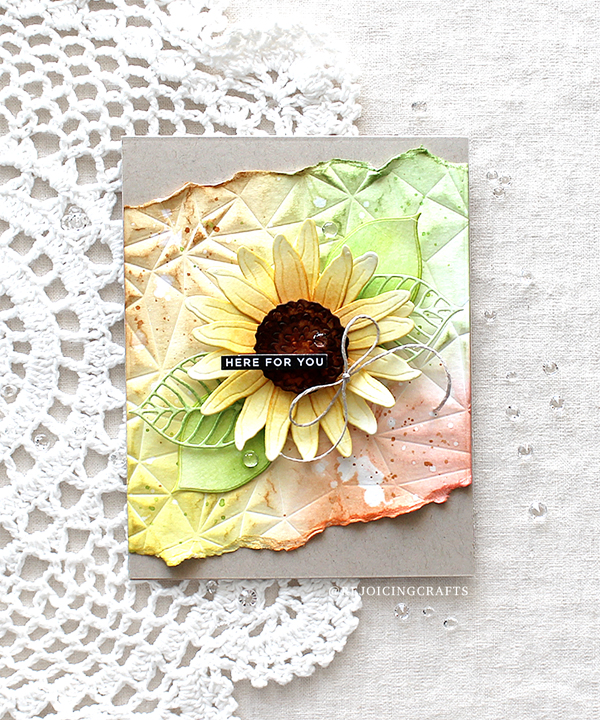 I laid stencil on watercolour paper panel without wavering, inked autumn coloured Distress inks on the top and bottom part of the panel. I die cut the Grateful Script from thick white cardstock and also die cut some tiny leaves from the same white cardstock using the Fall Tree die set.