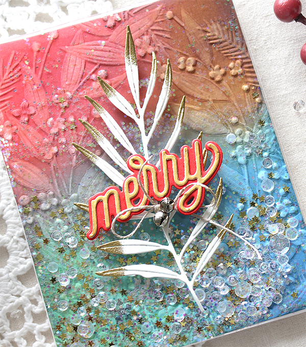 For my first card, I used the new Etched Delicate Frond die and Pine Bouquet embossing folder. I applied the Pine Bouquet embossing folder to A2 sized watercolour paper panel first, and then ink blended the panel with some Distress Oxide inks: Fired Brick, Vintage Photo, Cracked Pistachio and Faded Jeans. I then made edge-to-edge shaker panel with lots of sparkling sequins & confetti. I die cut the Etched Delicate Frond from thick white cardstock, then applied gold embossing powder to the end of each leaf. For the sentiment, I used the CZ Design Merry die set.