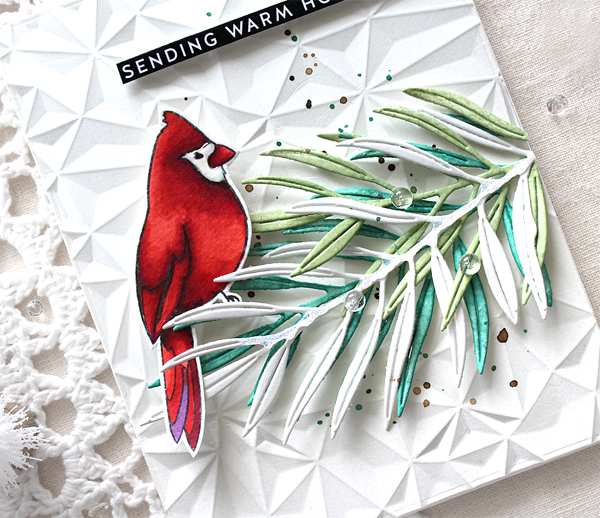I just could not resist another play with the gorgeous Etched Delicate Frond die. I die cut 3 fronds from thick white cardstock first. I then applied Distress inks to 2 fronds – one that I inked with Evergreen Bough, another that I inked with Bundled Sage. I stamped cardinal in the Winter Birds set on white cardstock using Memento Tuxedo Black, coloured it with Copic markers. I dry embossed the panel with the Crystal Distortion embossing folder, mounted it on white card base using double-side tape, then added all elements as shown in the picture. I was so happy to see the result!!