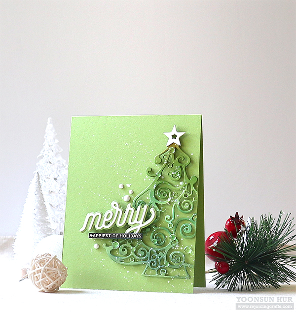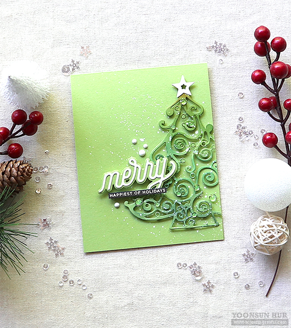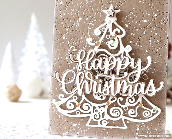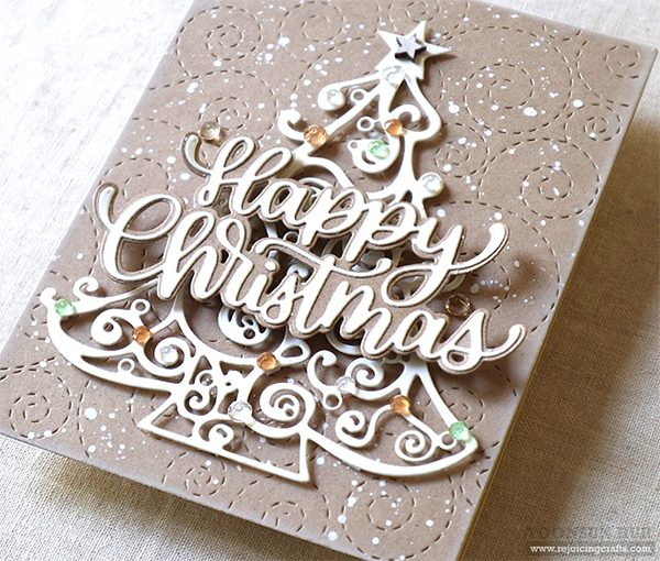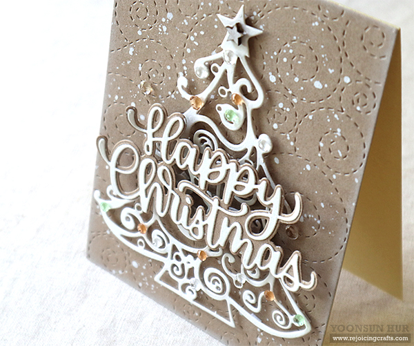 Today I have a couple of (kind of) traditional Christmas tree cards with the InLoveArts Christmas Tree die along with SSS products. I simply die cut all elements, Stitched Whirl Panel, Christmas Tree, Happy Christmas Sentiment from kraft & white cardstock. I then mounted the Stitched Whirl Panel on top-folded card base using double-sided tape first, and then added all die cuts onto the card using foam tape. I added opaque white ink splatters all over the panel, some crystals over the tree. I love kraft & white Christmas card sooooooo much!! :D This intricate Christmas Tree die is so pretty, isn’t it?