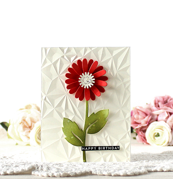 With the SSS Crystal Distortion embossing folder, I debossed onto A2 white paper panel and mounted it to the same sized card base using Dot Runner Adhesive. I then added the flower die cut to the centre of the card using foam tape.