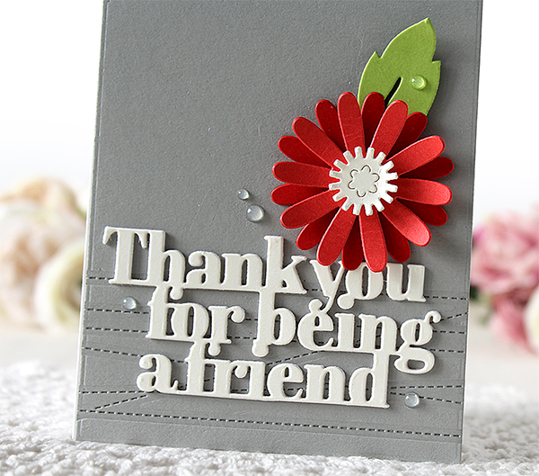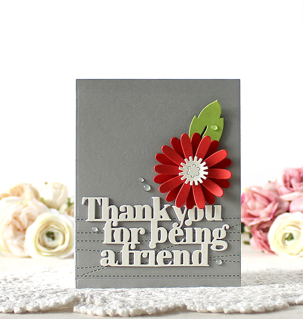 Here is another clean and simple floral card with the C9 Fresh Cut Florals Die. I adhered the red flower and sentiment on the bottom part of the C9 Dove card base.