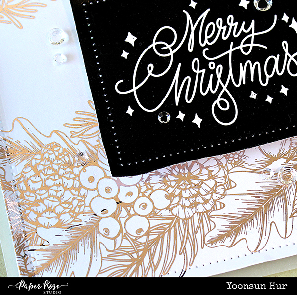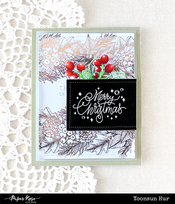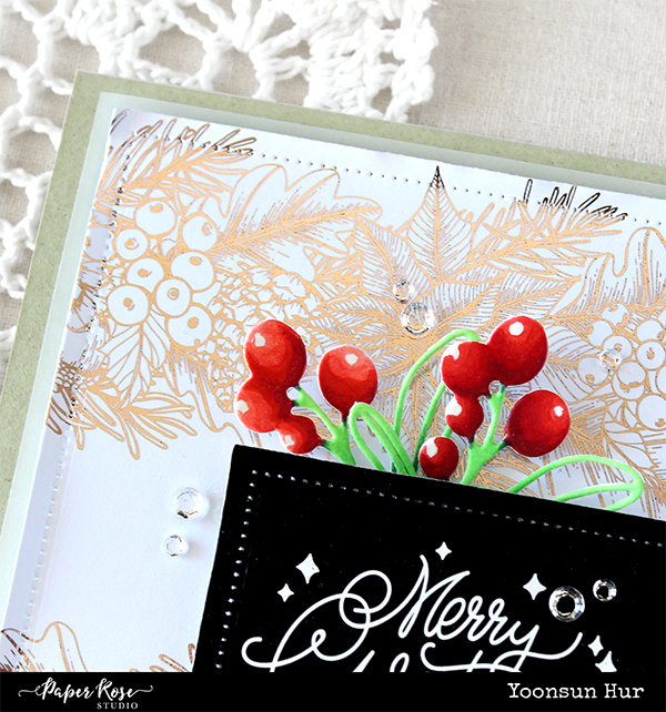I have a Christmas card with some lovely Paper Rose Studio winter-themed products – Poinsettia Rose Gold Foil 6×6 Paper Collection and Mistletoe Large die set.