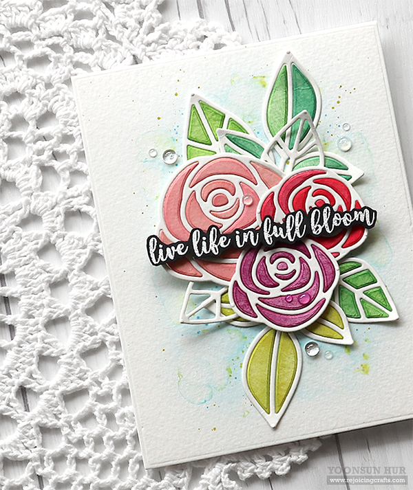 To create this card, I die cut flowers & leaves from watercolour paper using the