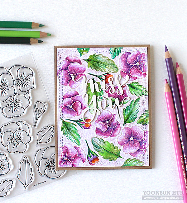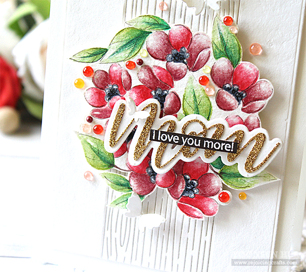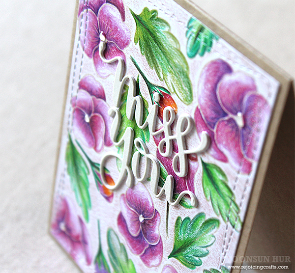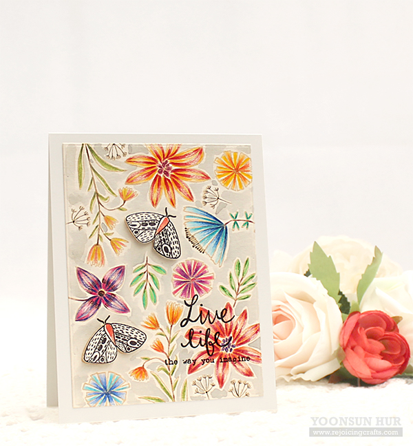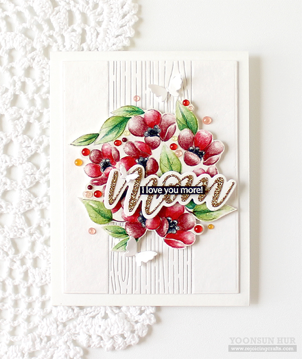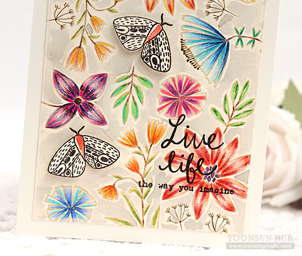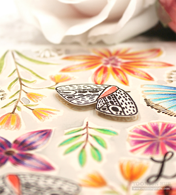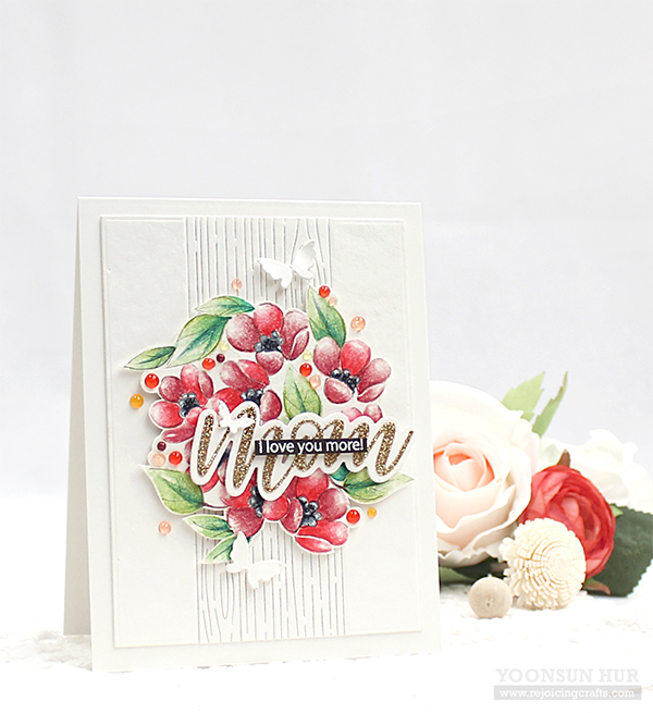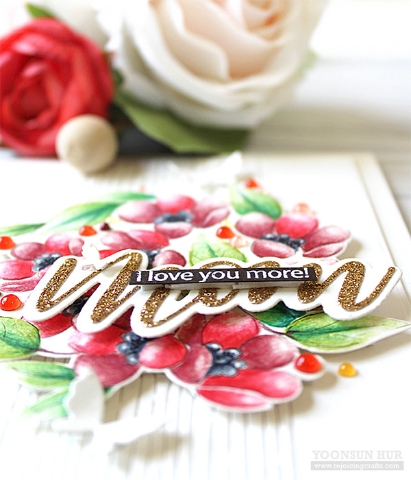 I mounted the woodgrain panel on top-folded white card base using double-sided tape first, and then added coloured flower image, sentiment die cut, tiny butterflies on the card front using foam tape. For the sentiment, I used the