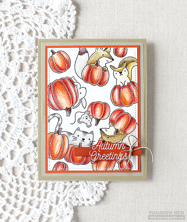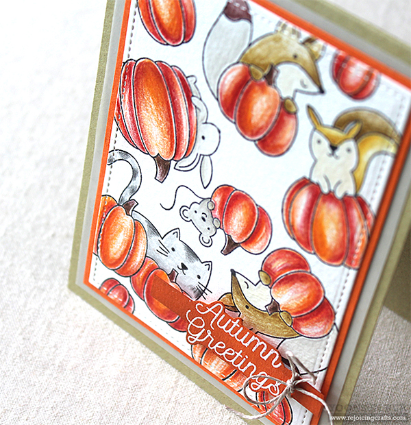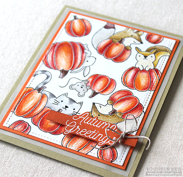 I randomly stamped adorable Pumpkin Patch Critters on stitched watercolour paper panel using Memento Tuxedo Black dye ink. I then coloured them with polychromos pencils. I made a white heat embossed sentiment banner as well.