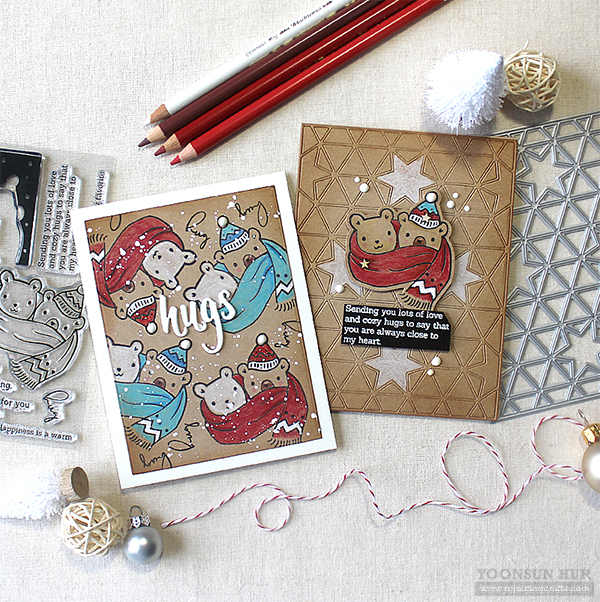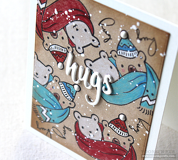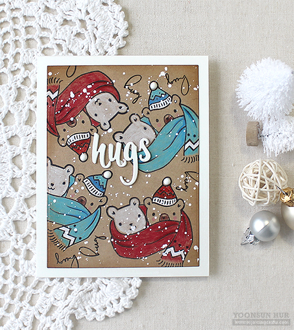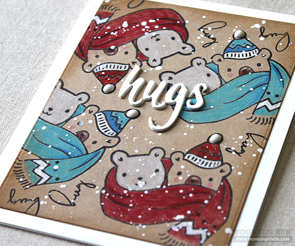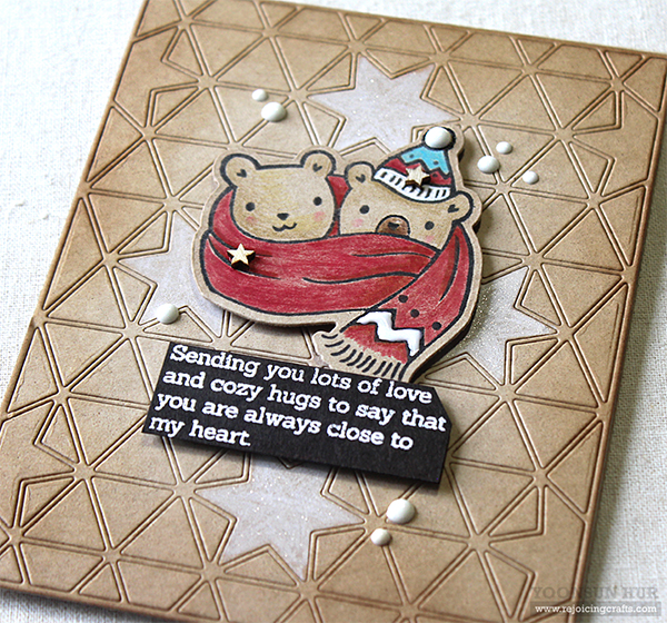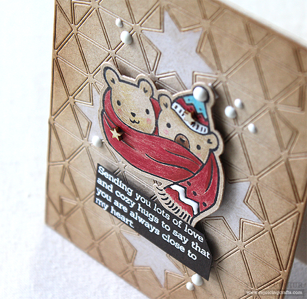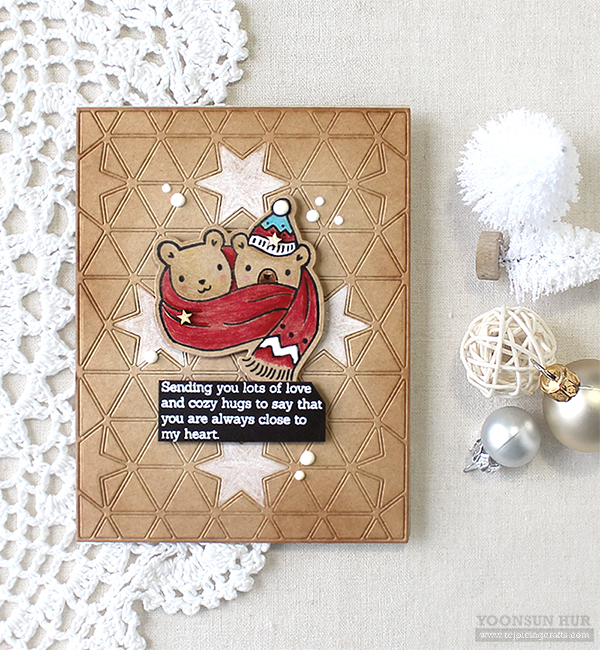 I started by stamping a cute hugging bear on kraft card stock using black dye ink. I coloured the stamped image with polychromos colored pencils, and then die cut it with matching die. I heat embossed the sentiment on black card stock in white.