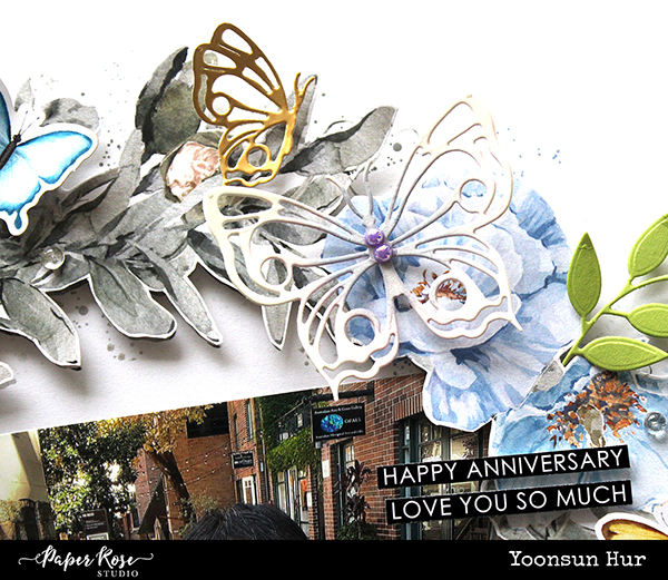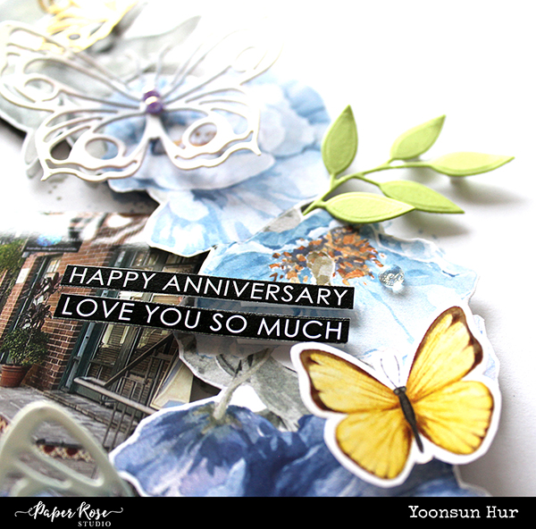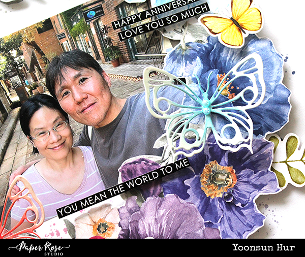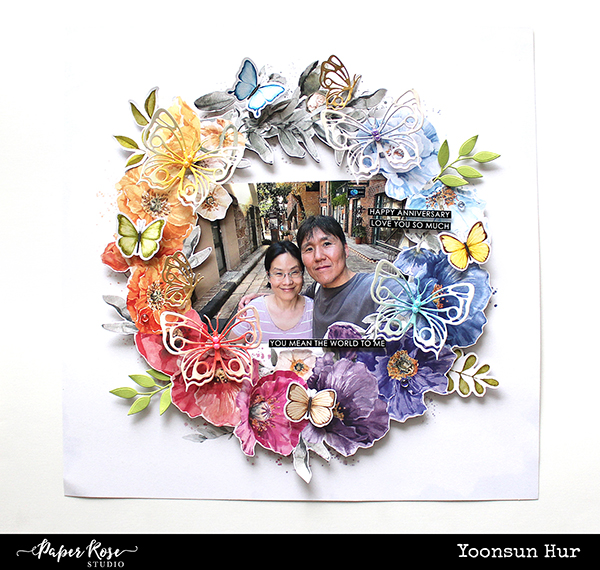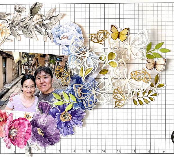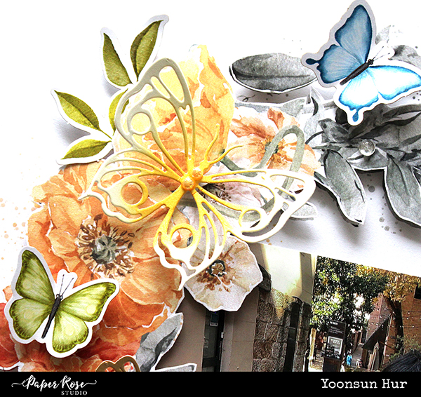 There were Rainbow Poppies wreath, butterflies, leaves and photo – ready to make scrapbook! I mounted the photo & Rainbow Poppies wreath on the base using foam tape first, and then added all elements.