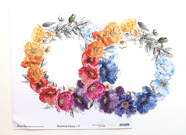 I prepared two sheets of paper with the same pattern first, then cut one of the Rainbow Poppies Wreath according to the shape with scissors.