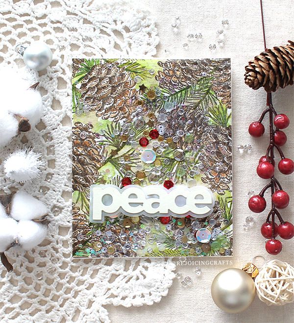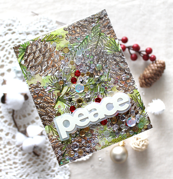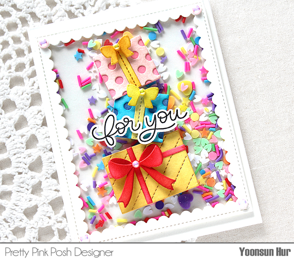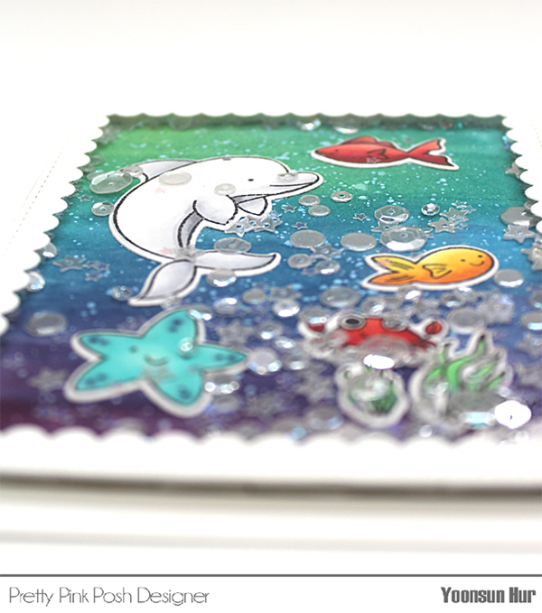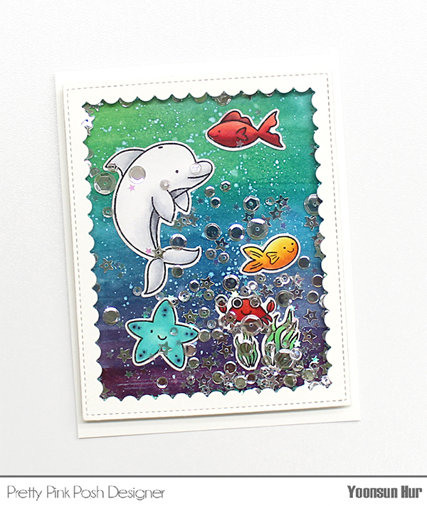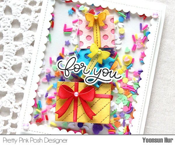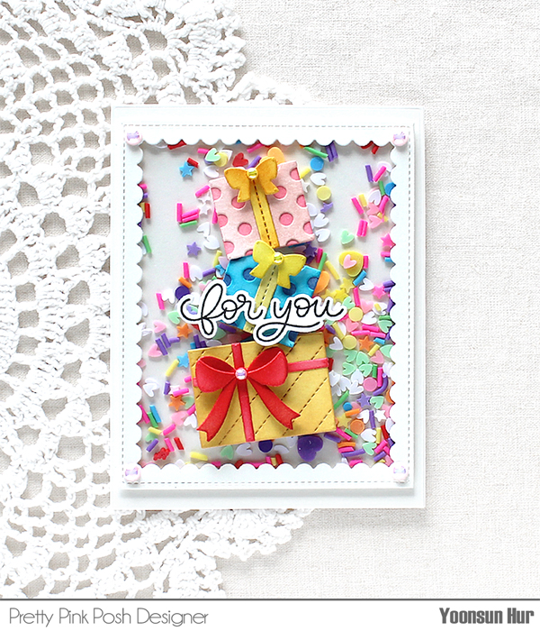 For the second card, I made edge-to-edge shaker card. For the background, I cut a piece of clear plastic bag bigger than A2 size, applied sticky double-side tape to all the edges of back of the background panel, covered the panel with clear plastic piece, and then filled it with the new Bunny Garden Clay Confetti, Iridescent Mini Circle and Iridescent Mini Star Confetti.