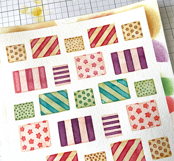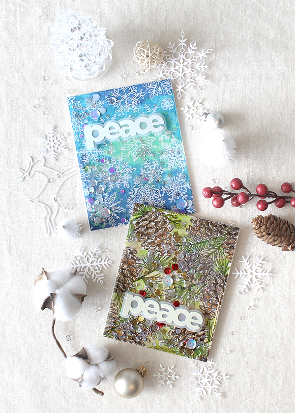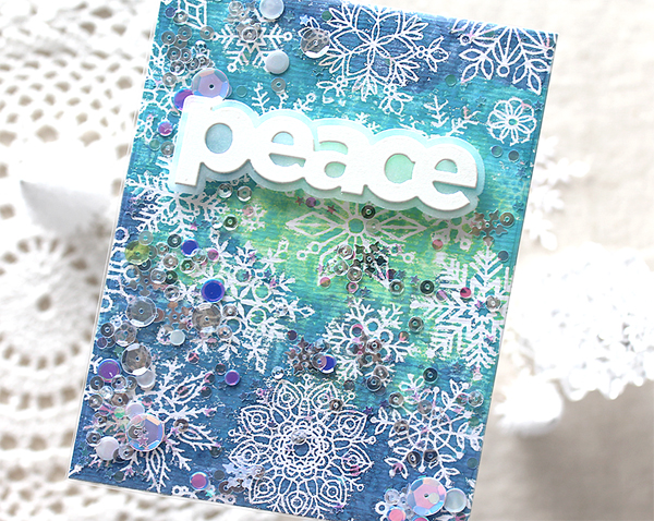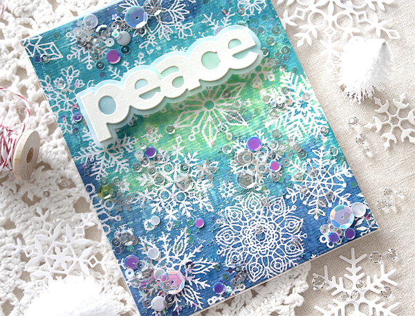 I decorated the card front with some snowflake die cuts, watercoloured objects.
