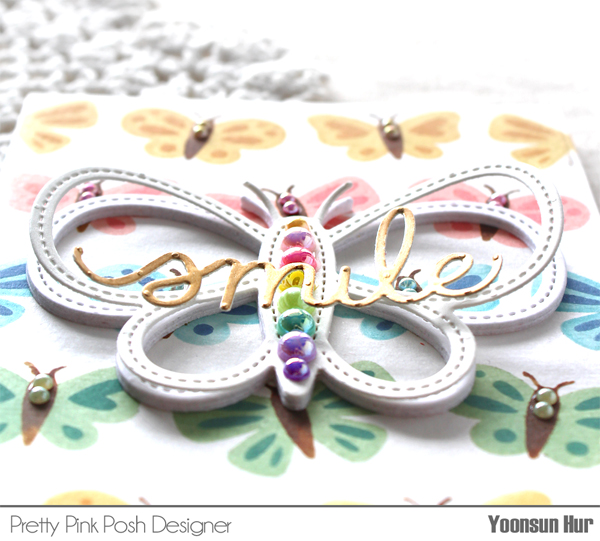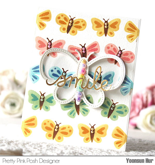 For my first card, I used the new Butterfly Shaker die, Smile Script die and Layered Butterflies stencil. All three new items are so adorable, right?!! I made cute butterflies background with the Layered Butterflies stencil and Distress inks.