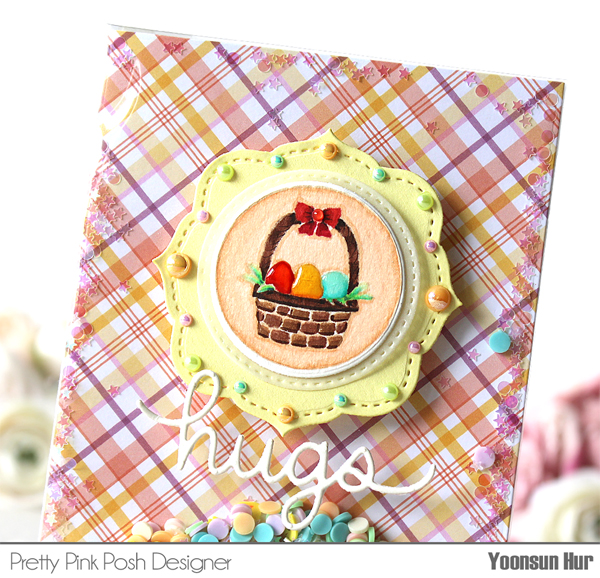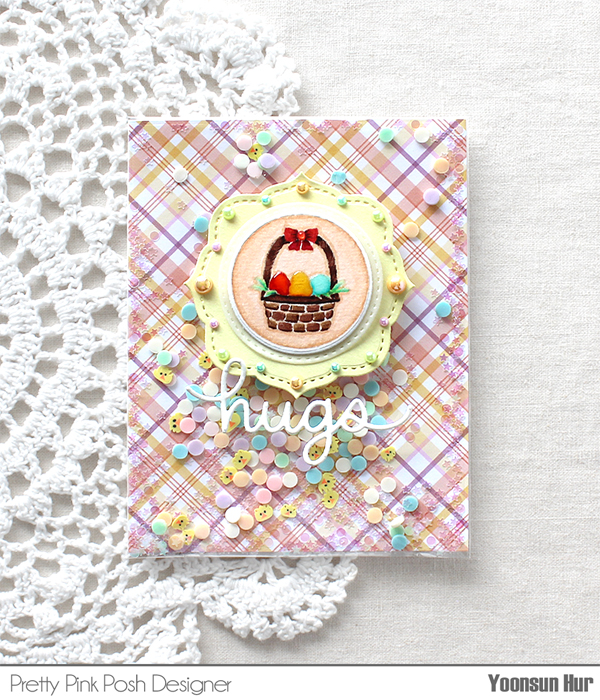 For the centre of the card, I stamped the Easter egg basket image in the Easter Circles set using pale beige dye ink, coloured it with Copic markers, and then die cut with the matching die. I love the floral shaped die in the Easter Circles coordinating die set.