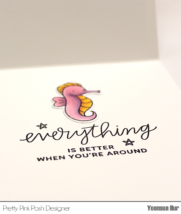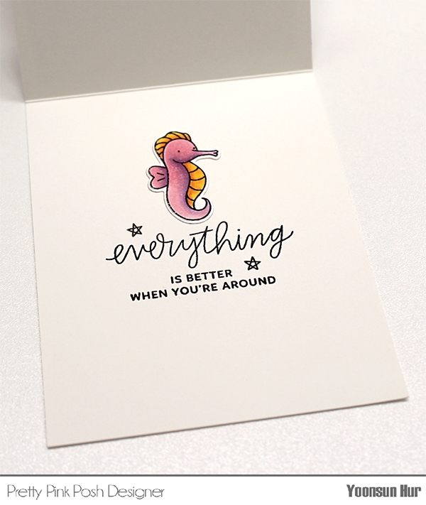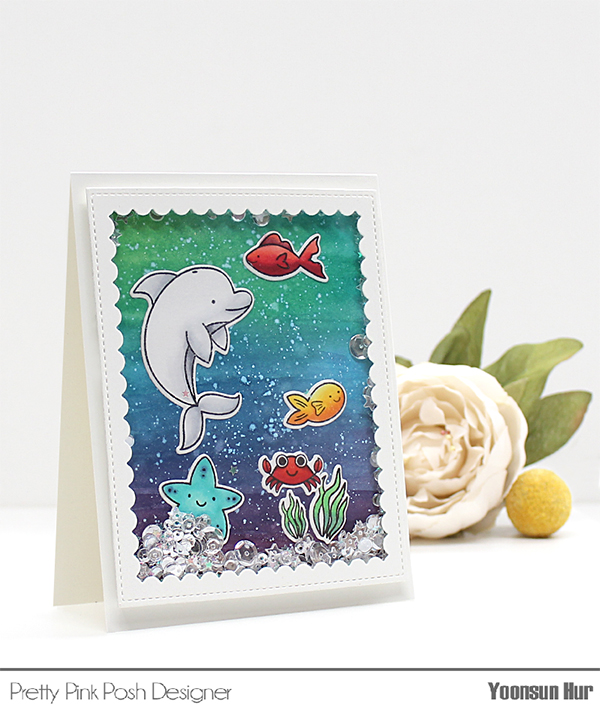 For the second card, I made edge-to-edge shaker card. For the background, I cut a piece of clear plastic bag bigger than A2 size, applied sticky double-side tape to all the edges of back of the background panel, covered the panel with clear plastic piece, and then filled it with the new Bunny Garden Clay Confetti, Iridescent Mini Circle and Iridescent Mini Star Confetti.