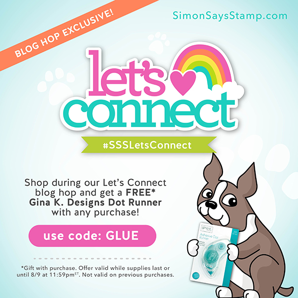 GIVEAWAY & BLOG HOP EXCLUSIVE PROMOTION! Simon Says Stamp is giving away a $25 coupon to every stop on the hop. The winners will be chosen over the weekend and post on Simon Says Stamp blog on Wednesday, the 12th of August. ONE MORE! Get a FREE Gina K.Designs Dot Runner with the code GLUE(while supplies last!) at checkout when you purchase at Simon Says Stamp Store.