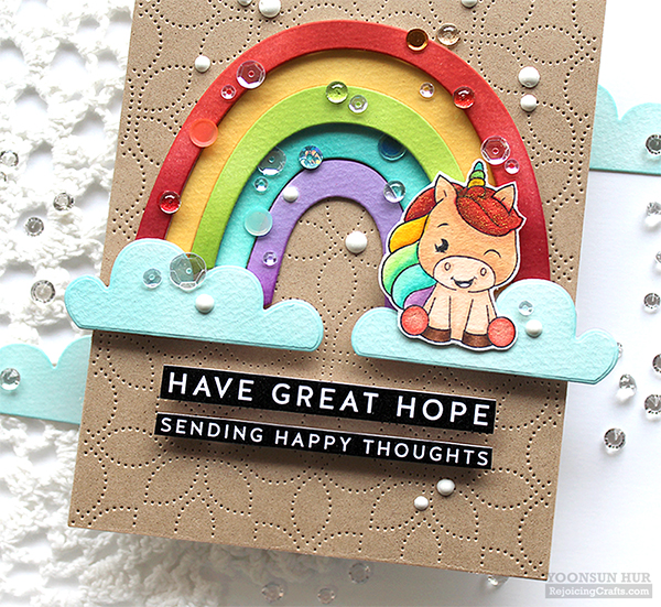 Are. You. Ready to enter the rainbow-coloured world? My cards will be full of rainbow colours today – just wanna say it “rainbowness.” Haha! :D For my first card, I used the Rainbow Card die set along with the Unicorn Love stamp set. I think the Rainbow Card die set will be a BIG HIT!! I die cut rainbow & clouds from watercolour paper using the Rainbow Card die set, then applied SSS dye inks to each ray of the rainbow in order of rainbow colours: