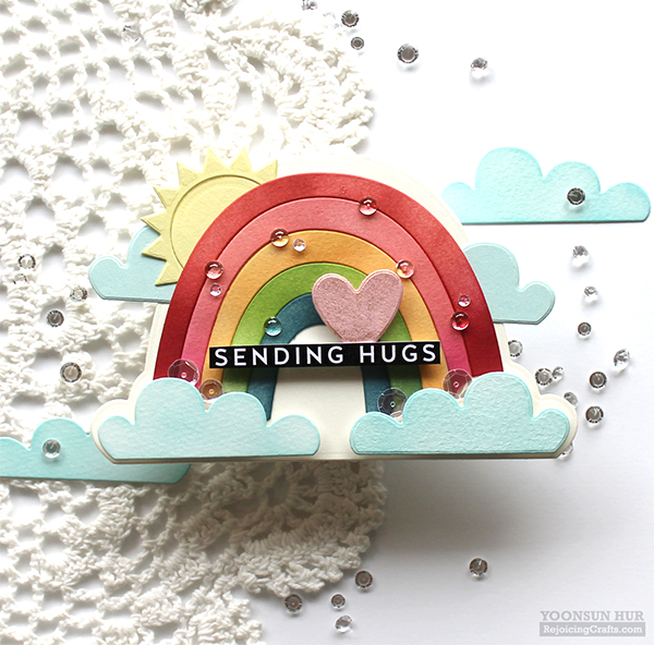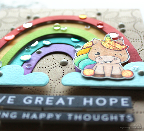 (from the top red colour) Lipstick Red, Duckling, Green Apple, Audrey Blue and Deep Purple. I stamped a cute unicorn from the Unicorn Love set on white cardstock using Memento Tuxedo Black dye ink, coloured it with Copic markers. I die cut the Detail Petal Plate from Neenah Smooth Desert Storm cardstock, then mounted it on the same Desert Storm card base using double-sided tape. I then added all elements as shown in the picture using foam tape. I added many of bling-bling sequins & droplets on the rainbow rays! It is another happy rainbow card on the rainbow shaped card base. I adhered the two clouds using foam tape first. I adhered the sun & other clouds to the back of the rainbow rays using double-sided tape, then adhered the rainbow rays in place. Oh, I love it. It makes me so happy! I really wanna send you happy hugs!!