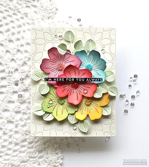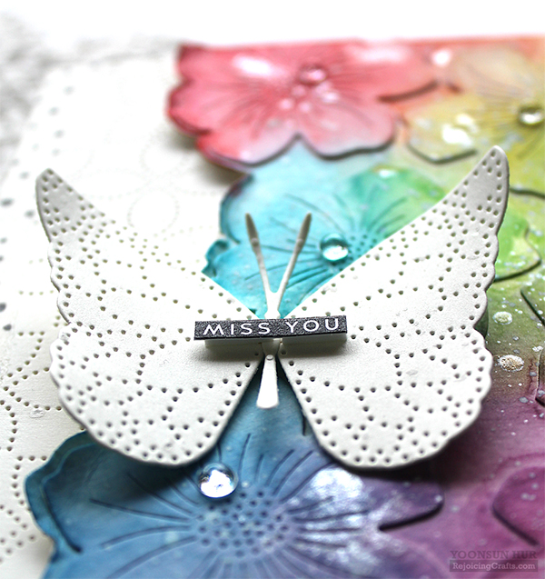 For my third cards, I used the Cosmos Bloom die along with Detail Petal Plate die. I die cut several cosmos from watercolour paper using the Cosmos Bloom die first, then applied rainbow coloured Distress inks to them using Blender Brushes: (Red)Festive Berries & Fired Brick (Yellow)Fossilized Amber & Tea Dye (Green)Crushed Olive & Evergreen Bough (Blue)Mermaid Lagoon & Faded Jeans (Purple)Seedless Preserves & Fired Brick I made a bouquet using rainbow coloured Cosmos Bloom & Eucalyptus Leaves die cuts, and then adhered on the centre of the Detail Petal Plate base using foam tape. I added stamens on the centre of each flower using PPP seed beads. Here is another rainbow floral card with the Cosmos Bloom die. I adhered flower die cuts on watercolour paper panel, then blended the floral panel with Distress inks. I then washed the colours using a wet paint brush, added opaque white & metallic silver ink splatters all around the panel. I die cut the Detail Meadow Butterfly from ivory cardstock. The sentiment, I used it in the Sentiment Strips Thinking of You.