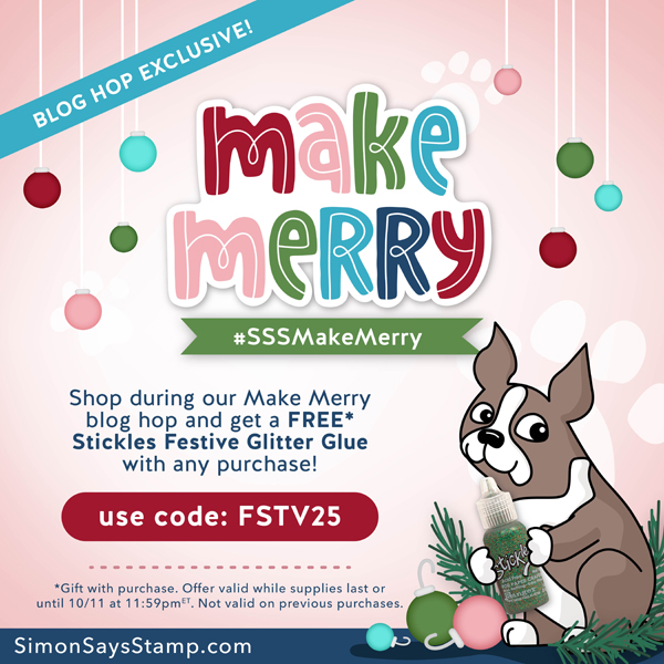 Simon Says Stamp is giving away a $25 coupon to every stop on the hop. The winners will be chosen over the weekend and post on Simon Says Stamp blog on Wednesday, the 14th of October. ONE MORE! Get a FREE Stickles Festive Glitter Glue with the code FSTV25(this promotion will expire 10/11 at 11:59 pm EDT) at checkout when you purchase at Simon Says Stamp Store.