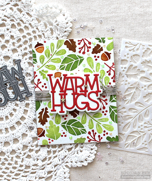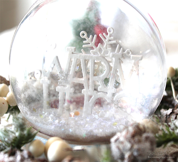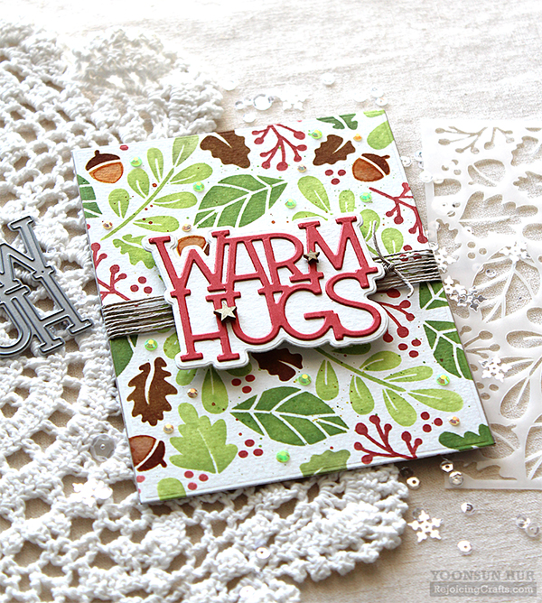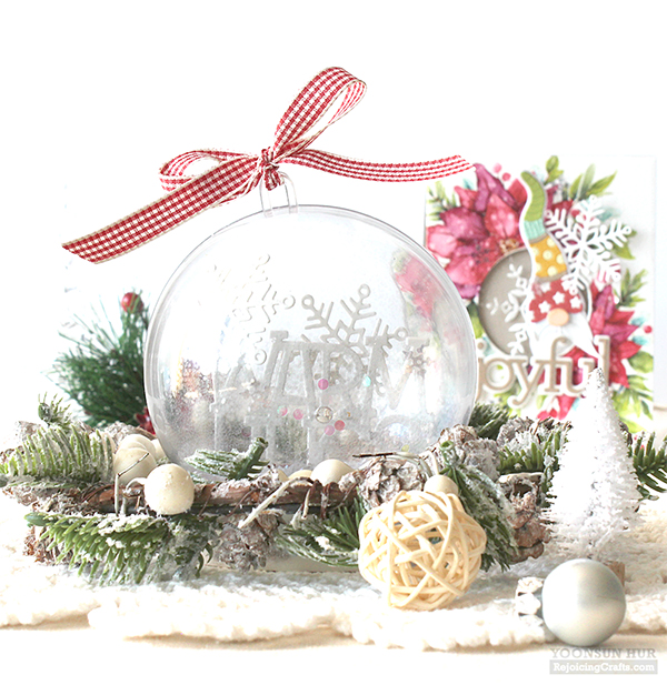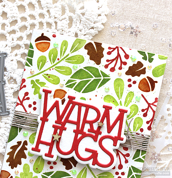 For my second card, I used the Falling Leaves layering stencils & the Warm Hugs dies. with the first leaves stencil, I inked with Green Apple dye ink. The second leaves stencil, I inked with Green Leaf dye ink. The berries stencil, I inked with Lipstick Red dye ink. Lastly I laid acorn stencil over the panel, then inked with Rusty Hinge & Gathered Twigs Distress inks. For the sentiment, I used the Warm Hugs dies. It is so easy to make pretty card with layering stencils! :D For my last project for the hop, I made a very simple Christmas ornament ball with Warm Hugs dies. I made thick white “Warm Hugs” word die cut, then glued firmly to the bottom of the clear plastic ball using multi medium matte. I filled a clear ball with lots of clear sparkling sequins & glitters.