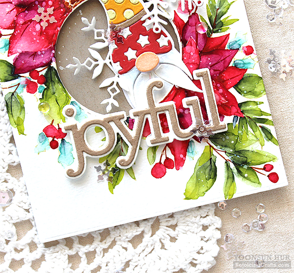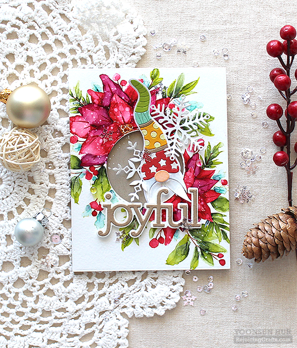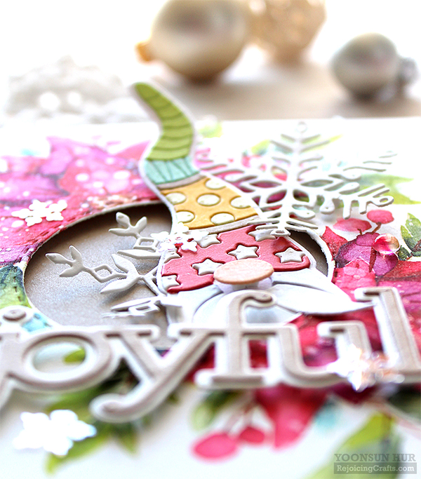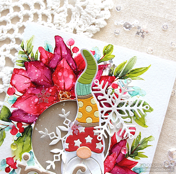 Hello crafty friends! Welcome to Day 2 of the Simon Says Stamp Make Merry Release Blog Hop. I’m especially excited to be a part of this amazing blog hop because it’s Christmas hop, woohoo!! If you arrived here from super talented Heather Hoffman’s blog you are on the right track! For my first card, I am featuring the new Center Cut Holiday Floral background stamp & the Deco Hat Gnome die. As many of you know watercolouring is my most favourite way to play with in my craft room! With these awesome goodies, I made a no-line watercoloured card. I stamped the holiday flowers on A2 sized watercolour paper panel using Antique Linen Distress ink first, and then coloured the stamped image with Tonic Nuvo Aqua Flow Pens: (Flowers & Berries)Red Apple, Wild Phlox (Leaves) Sliced Kiwi, Aqua Splash, Indigo Batik (Stems) Yellow Ochre, Caramel Pecan I coloured with Aqua Flow Pen first, then added water using water brush. Once the watercoloured panel was dry, I cut the centre of the panel using Stitched Circle die. For the Deco Hat Gnome, I die cut Deco Hat from several colour cardstock – Lipstick Red, Sunshine, Mint and Green Apple. For the sentiment, I used the CZ Design Joyful dies. Isn’t this gnome so cute?!! :D