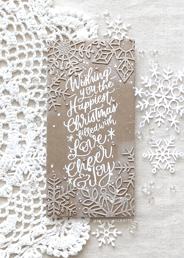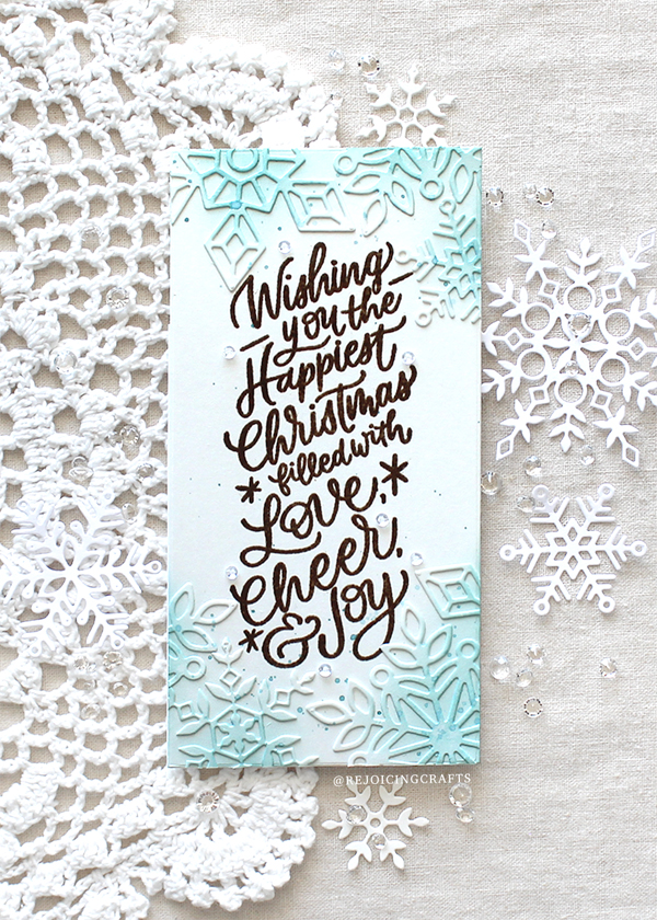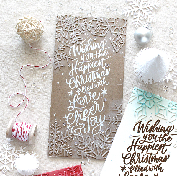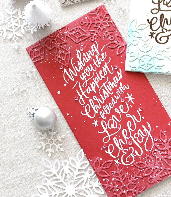 For my second mini slimline holiday card, I used white cardstock. For the sentiment, I stamped it with VersaFine Vintage Sepia pigment ink, then added clear embossing powder.