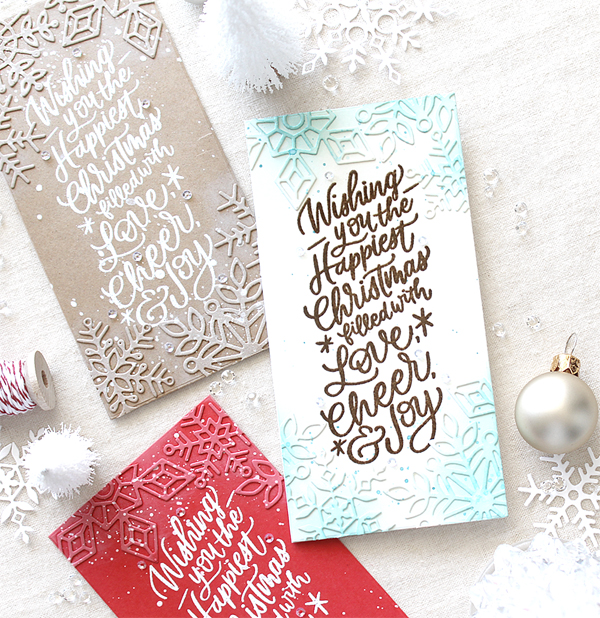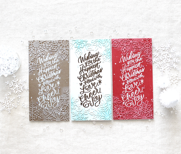 Today I have mini slimline Christmas card trio with the SSS Holiday Greetings Mix 1 stamp set and lots of snowflake dies.