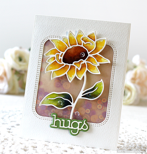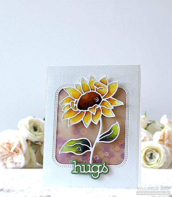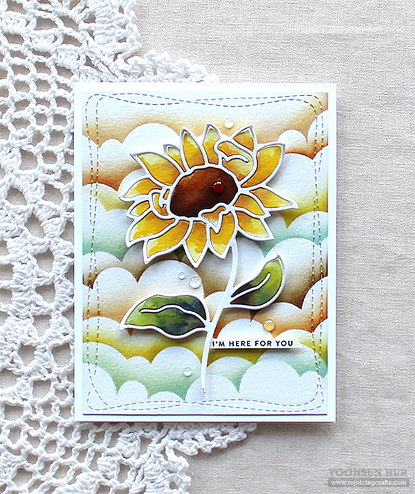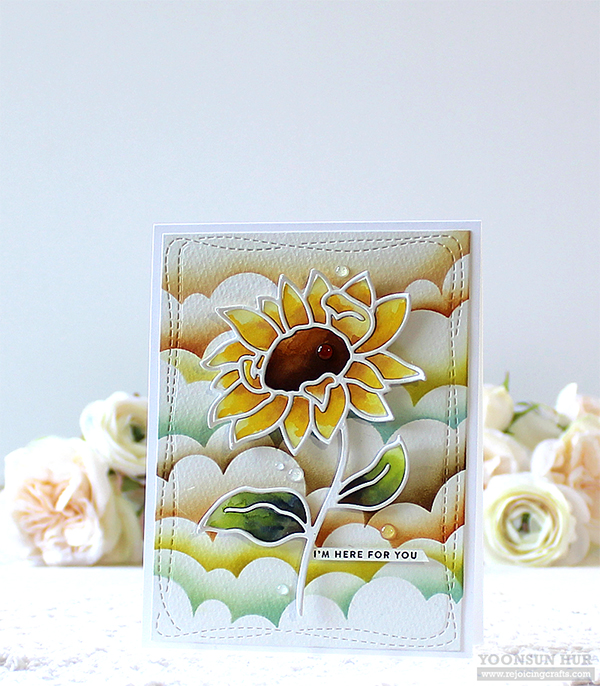 I mounted the clouds background panel on white card base using double-sided tape first, and then added the watercoloured sunflower & sentiment banner using foam tape.