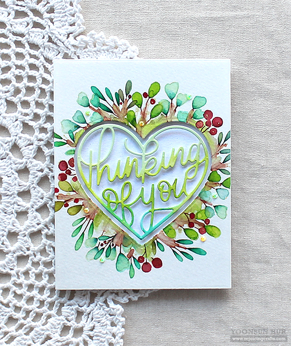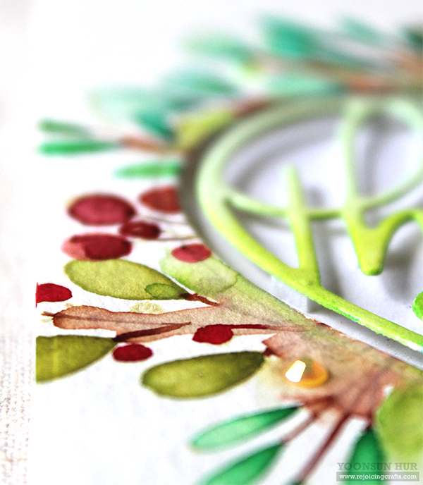 For the green leaves, I used the Detailed Rose die set. I die cut solid & detailed leaves from watercolour paper first, and then inked with Crushed Olive Distress ink.