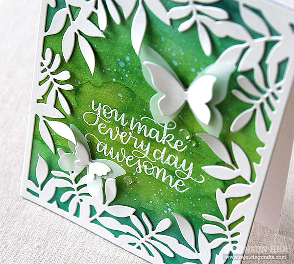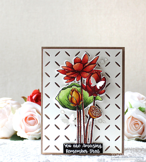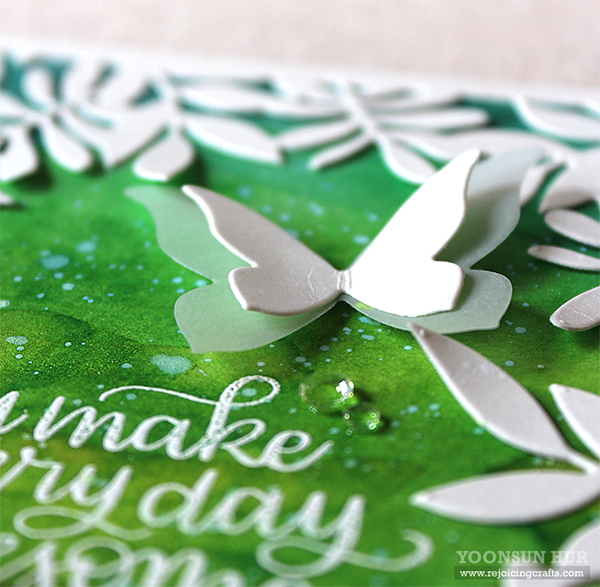 Once the background panel was dry, I mounted it on white card base using double-sided tape first, and then added all elements using foam tape. I embellished with a few