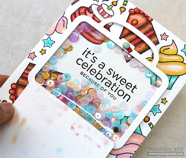 I started by die-cutting 4.25″ x 5.5″ rectangle panel from watercolour paper using the Basic Rectangle Panel die. I then randomly stamped birthday cakes, candles, stars from the CZ Design Birthday Sweets set on watercolour paper panel using Memento Tuxedo Black dye ink. I coloured all stamped images with Altenew Artist Markers. I die cut the Lunchbox from a separate watercolour paper, stamped images with black dye ink, then coloured them with alcohol markers as well.