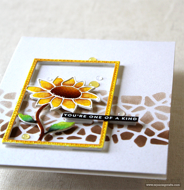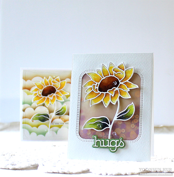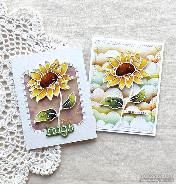 I mounted the clouds background panel on white card base using double-sided tape first, and then added the watercoloured sunflower & sentiment banner using foam tape.
