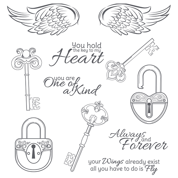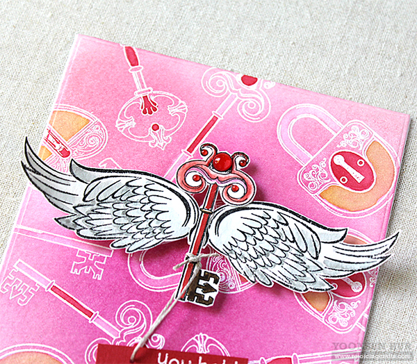 I mounted the panel on white card base using double-sided tape first, and then added watercoloured wings & key, sentiment banner on the centre of the card front using foam tape.