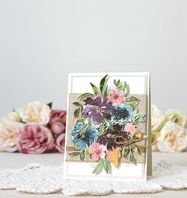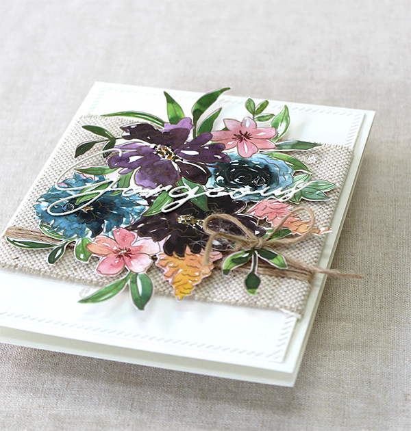 I die cut the Diagonal Stitched Rectangle Panel from white card stock, and then decorated the panel with burlap & natural twine. I mounted the panel on the same coloured white card base using double-sided tape, then added a beautiful painted flowers using foam tape.