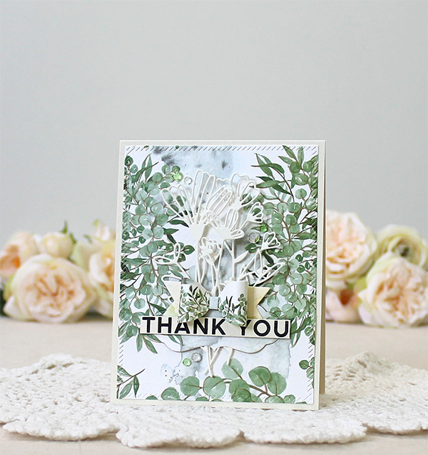I adhered a large floral bouquet image of the Painted Florals Washi Tape on white card stock first, and then fussy cut it – using Floral Cluster Die is much easier way!